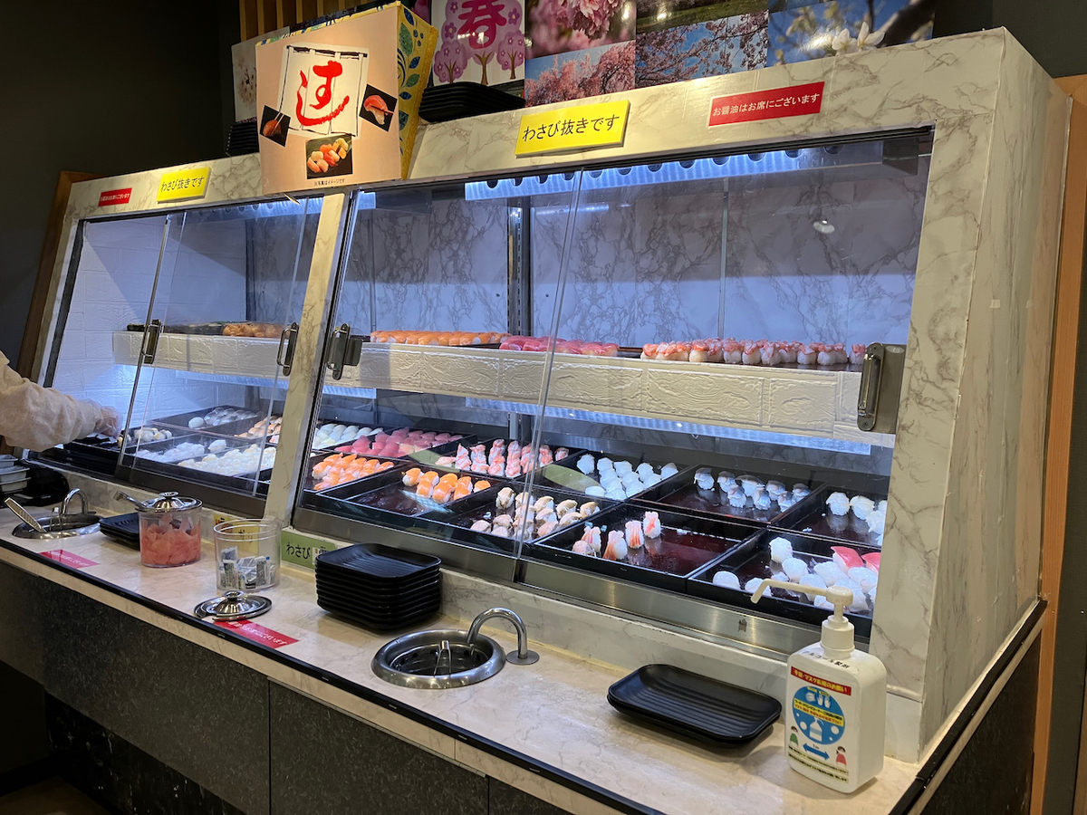 寿司はマグロ、サーモン、イカ、エビ、白つぶなど種類豊富。
